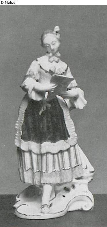 Girl with music sheet. Standing, she holds the sheet in both hands and looks at the notes. She wears a copper-green bonnet on the hair bound by a black ribbon. Around the neck a beaded chain with purple loop. Straight cut at the neckline and the sleeves of the light yellow waist. Blue-and-white striped skirt with purple-pink volant, black apron with purpurrosa trimming. Yellow shoes with blue seams. The seed beads are raised with gold. Pressed sign (visible on the base). Model of Franz Anton Bustelli