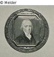 Miniature box with lid, box with portrait miniature of gold à deux Couleurs, circular; base, walls and lid framed by plant borders; surfaces guilloched and decorated with punched dots; miniature depicting an old gentleman in a white tie and black skirt; it is set in an elongated octagon and affixed to the top of the lid; several stamps stamped inside: Stamp of guarantee of the Parisian guild since 1794 (R3 6564) and stamp C under animal head in rhombus, uninterpreted