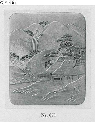rectangular with rounded corners, decorated in polychrome gold and silver: landscape with high mountains and waterfall