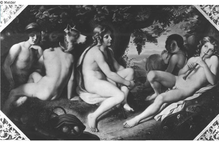 Signed lower left: J H 1848. Five half-naked shepherd boys between flowers and fruit under vine-covered trees. On the right one of the boys is lying, blowing his flute, leaning against a beech trunk. Next to him a younger one is caressing a lamb. In the middle the third one is listening. On the left at the spring the fourth is stroking a large dog, the fifth with a red Phrygian cap. In the back on the right the sunny bay.