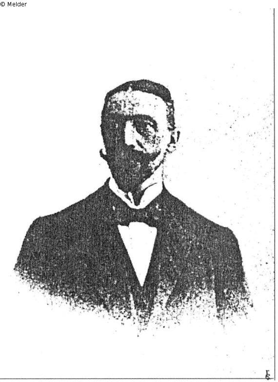 A frontal portrait of a gentleman with a broad twirled moustache, his fixed gaze slightly to the right, passing the viewer; dressed in a tight-fitting dark, probably black tuxedo jacket with large silk(?) lapels, a white shirt with stand-up collar underneath, and a tied dark bow tie. In the lower part the picture ends in a wide-angled, asymmetrical triangular shape, applied in the manner of a dot.