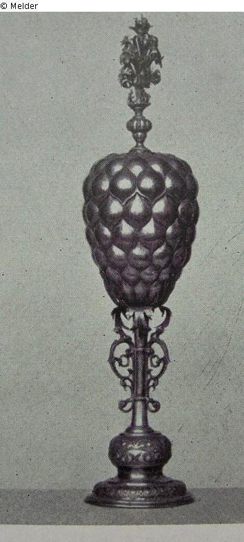 Search Request | Object report Great pineapple cup Lost Art-ID414755 Previous Next Artist / Creator Weinert, David Lebensdatengestorben 1630 TitleGreat pineapple cup Dating1600 (um)Object typeCrafts and other folk artsGroup of reported objectsCrafts and other folk artsMaterial / TechniqueMetal (Silver) ; Metal (Silver sheet) Height 42.50 cm Description chased bell base, shaft set with agraffes, bouquet of silver sheet as lid crowning, maker's mark DW Read more Read less Provenance Collection Max Silberberg, Breslau; 12.10.1935 auction Paul Graupe, Berlin, lot 188 (sold for 220 RM); whereabouts unknown Read more Read less Published since2010 Contact Dr. Monika TatzkowPositionWissenschaftlicher DokumentationsdienstPhone+49 (0) 30 64 128 13E-Mailtatzkow@t-online.de