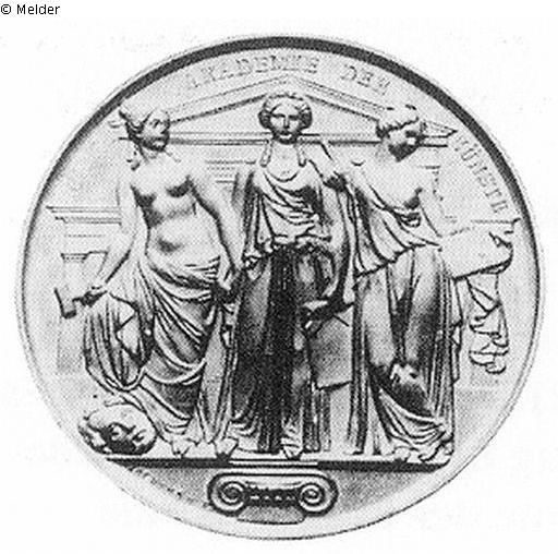 Rs.: Drei weibliche allegorische Figuren die Bildhauer-, Bau- und Zeichenkunst symbolisierend, vor einem Tempel stehend; Umschrift: KÖNIGL AKADEMIE DER KÜNSTE (Signatur) IACHTMANN F.