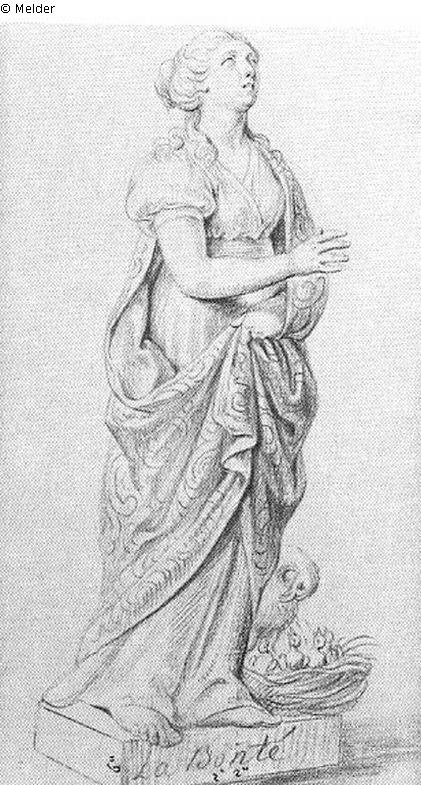 Vierzig Entwürfe zum bauplastischen Figurenprogramm am Französischen Dom zu Berlin; Alte Inv.Nr. 856/1934; Blatt 1-38 derzeit in Berliner Privatbesitz; Blatt 18-26 Entwürfe für Tugendalleegorien als Giebelfiguren: neun Figuren geplant; Blatt 21-24 Entwürfe für die Nordseite; Blatt 24 Bez.: La Bonté / (Maßangaben) 6", 2'2"