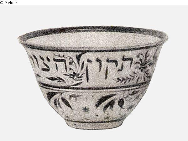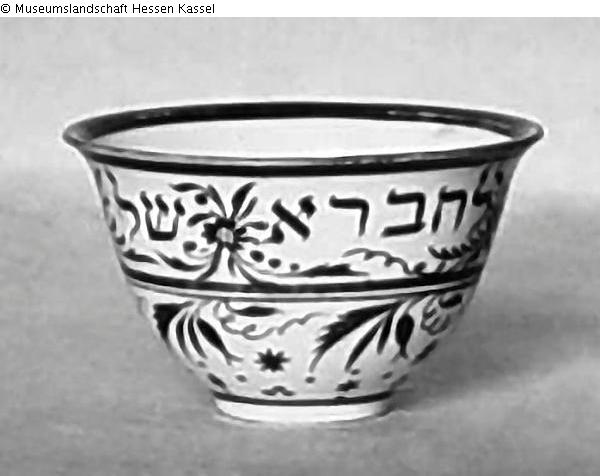 No handle, no mark. White with gold painting and Hebrew inscription: "Lechevroh schel tikum chazott" [Lakhevra shel tikun chatzot].