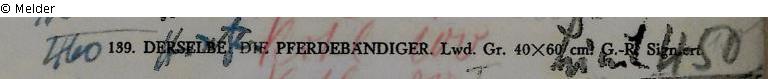 Collection Eduard Fuchs until 1933; 25.10.1933 confiscation by the Gestapo; auction house Rudolph Lepke, Berlin, catalogue 2114; on 16 and 17.06.1937 the painting is published as no. 139 "Die Pferdebändiger - Lwd. Gr. 40 x 60 cm, GR, signiert"; bought by the Berlin art dealer Frieda Hinze for 460,- RM (estimated price 450,- RM); whereabouts unknown