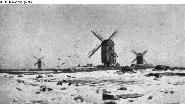 Panel painting: Depiction: Windmill in a landscape & winter landscape; landscape denoting winter (in the division of the year into four seasons) & snow.
