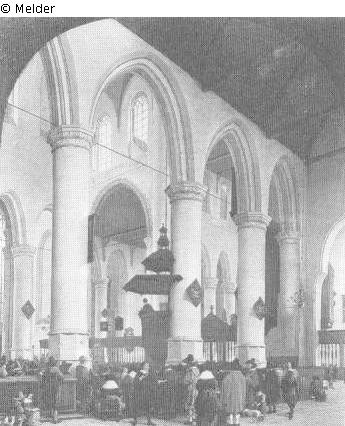 Aus dem nördlichen Seitenschiff Blick ins Mittelschiff schräg an der Kanzel vorbei zum Chor während des Gottesdienstes; besetzte Bänke und stehende Figuren im Vordergrund hinter dem Kanzelpfeiler; Signatur: H. van : vliet. 1659