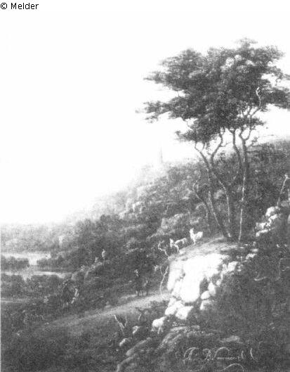 A landscape with wooded mountains and a stream in the middle ground to the left. To the right on a large boulder are three tall trees and two goats under them. At the bottom is a road. Signed in the lower right corner.