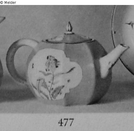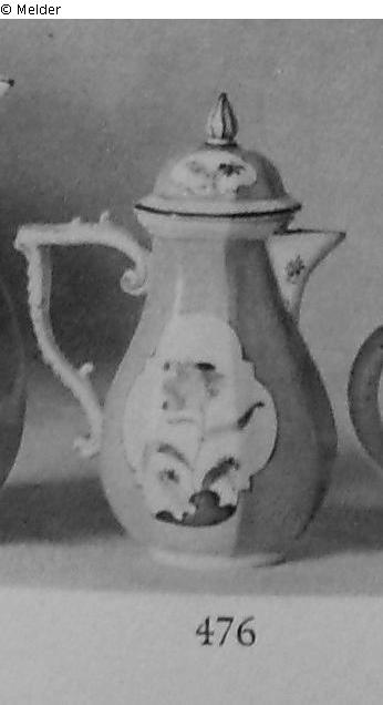 bei Helbing: Kaffee-, Milch- und Teekanne; Kaffeekanne: achtteilig, birnförmig, mit kurvig geschwungenem Henkel und Schnabelausguss, gelber Fond, an Kanne und Deckel je weiße Felder ausgespart, bemalt mit indianischen Blumen, Streublumen am Ausguss, Henkel purpurstaffiert, Schwertermarke, Kaffeekanne, klein: wie Gundersheimer Gutachten S. 29, Nr. 37, Fond und Bemalung wie dort, Ergänzungen am Ausguss, Schwertermarke,