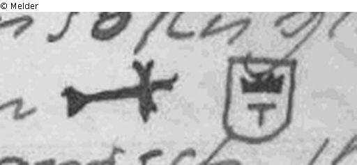 Eisenspangengefäß, geriffelt, ebenso kugeliger Knauf (w.o.), Eisendrahtgriff, zweischneidige Klinge m. Hohlkehle u. Marken; vgl. Nr. 34