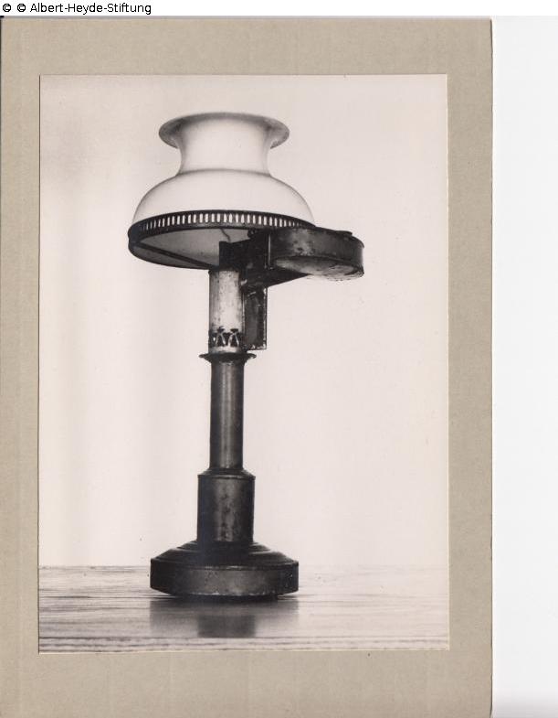 Table lamp on a round base made of green lacquered sheet metal. Oil container attached to the side. A bulging frosted glass bell as a light shield. A glass tube is missing.