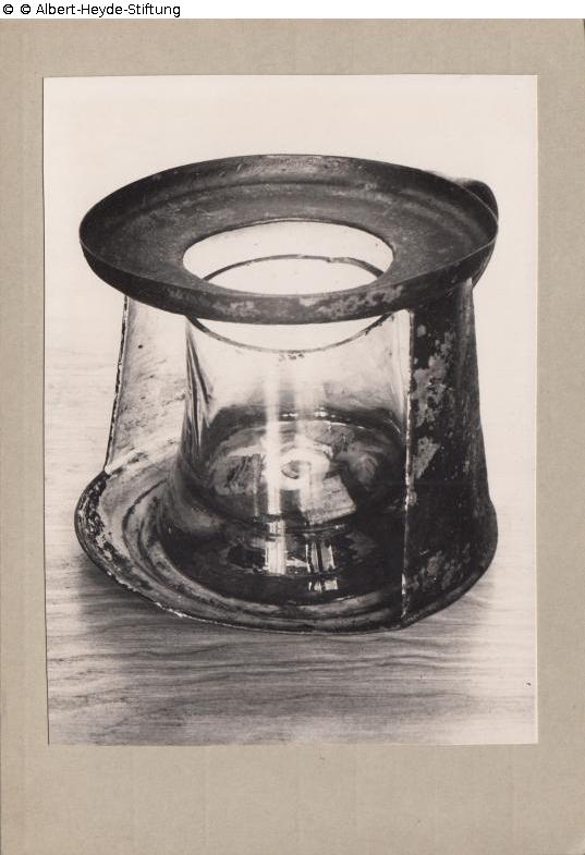 Conical tin vessel with handle and base for the light, the front cut out. It contains a glass beaker, also conical, as an oil container.
