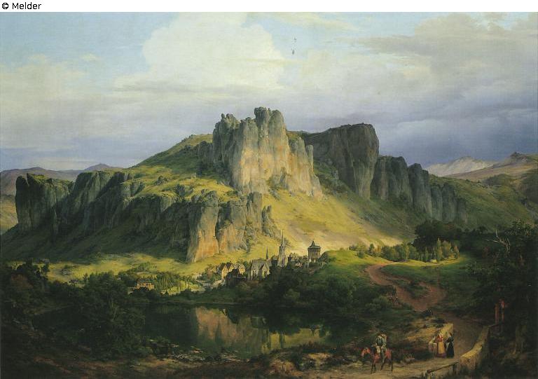 Panel painting: Picture: Rock & prospectus of a town, town panorama, silhouette of a town & lake & country road, path, trail & landscape with a bridge, viaduct or aqueduct & riding on a horse, donkey, mule, etc.; rider(s) & hilly landscape : extinct volcano