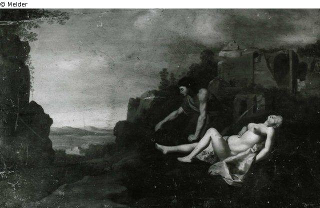 Landscape with sleeping nymph and youth who picks a flower