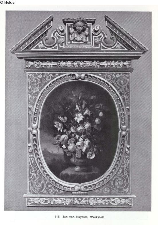 Lepke: A bouquet of roses, lilies, tulips and anemones in a brown stone vase. View of landscape on the left. High oval. In a heavy, old carved and gilded frame; angel's head in the attachment. Fig. plate 12