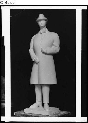 Sculpture depicting a man. The body is impressive. He wears a hat and a bow tie. His face is lightly sketched.