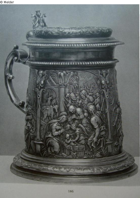 Of cylindrical form, slightly tapering towards the top, foot and lid bead in relief with ribbon work. On the walk under arcade arches four figure reliefs: Annunciation of Mary, Adoration of the Shepherds, Adoration of the Magi, Circumcision in the Temple. In the lid a medallion with the Christ child on a globe. The curved handle is made of cartilage, the thumb rest is a mermaid. Augsburg assayer's and master's mark A.B.