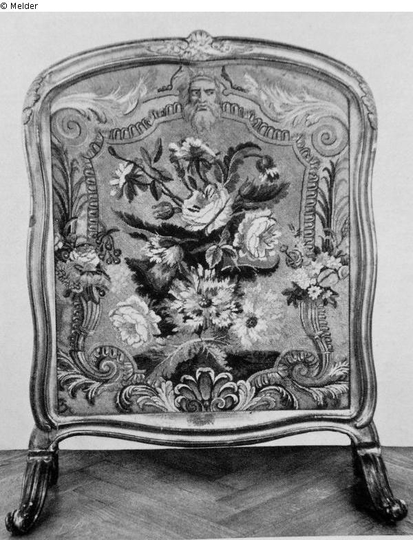Vergoldetes Gestell. Pointbezug in Wolle und Seide: Rosenstrauß auf hellblauem Grund von Voluten und barocken Blattranken gerahmt. Der Bezug: Frankreich, 2. Viertel 18. Jahrh.