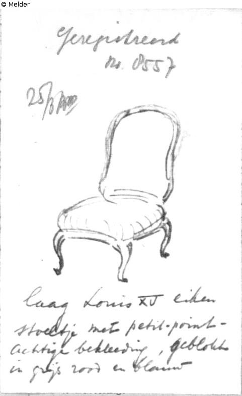 source: Algemeen Politieblad van het Koninkrijk der Nederlanden, Jg. 95, Nr. 34, 30. November 1946 publizierten Liste 719 „Te ‘s-Gravenhage ontvreemd in 1943/1944, hollandsche teekeningen, t. w.“; Intern Aangifte Formulier vom 25.3.1946, BArch Koblenz B 323/2 fol. 153 mit eigenhändiger Skizze von F. Lugt;