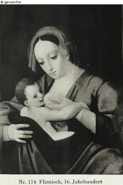 Half-length figure of Mary, nursing the child; probably made by Lambert-Lombard (1505-1566 Lüttich); golden frame;