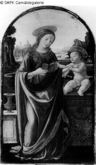 Panel painting: depiction: Mary standing (or half-figured), the Christ child sitting in front of her; sitting