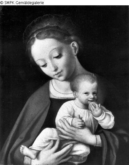 Tafelmalerei: Bild: Maria stehend (oder halbfigurig), das Christuskind auf ihrem Arm und an ihrer Brust, zu ihrer Linken : das Christuskind hält etwas in der Hand, z.B. Kirschen, Weintrauben, einen Apfel, einen Vogel, ein Kruzifix, eine Papierwindmühle (in Madonnendarstellungen); Madonna; links : Apfel; Vogel; Kirsche; Kruzifix; Weintraube; Mühle; halten