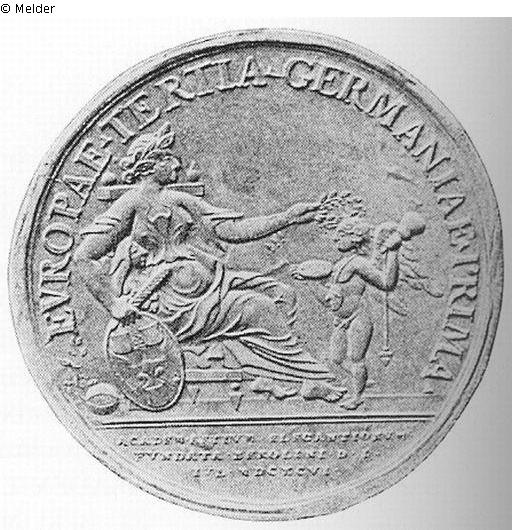 Rs.: Weibliche Personifikation der Akademie, in ihrer Rechten das Künstlerwappen mit dem preußischen Adler und eine Feile haltend, mit der Linken einen geflügelten Genius mit Lorbeer bekränzend; Umschrift: EVROPAE · TERTIA · GERMANIAE · PRIMA / ACADEM · ARTIVM · ELEGANTIORVM · FVNDATA · BEROLINI · D · I · IVL · MDCXCVI