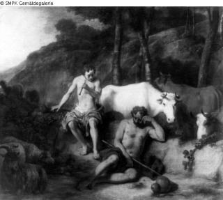 Panel painting: depiction: Mercury puts Argus to sleep with music; Mercury; Argus; making music; lullaby; sleeping; flute; Signature: Lower right: G. v. Eeckhout fe./Ano 1666; Dimensions: 94 x 110 cm