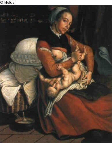 Mother with child, seated in whole figure, with exposed breast the naked child is drained;