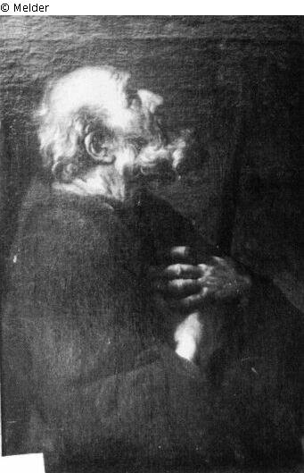 Three quarter length figure in profile of a balding bearded old man with hands folded on his chest in prayerful ecstasy.