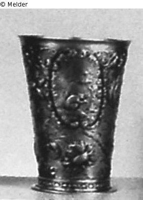 Konische Form auf glattem Fuß. Die Wandung reich getrieben und graviert: Maskarons, Blumen- und Blattwerk, in Kartuschen Tierdarstellungen. Danzig. Danziger Beschau- und Meistermarke M.H. Gew. 250 g.