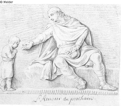 Vierzig Entwürfe zum bauplastischen Figurenprogramm am Französischen Dom zu Berlin; Alte Inv.Nr. 856/1934; Blatt 1-38 derzeit in Berliner Privatbesitz; Blatt 32-35 Entwürfe für szenische Tugendallegorien als Reliefs am Turmzylinder: sechs Reliefs geplant, Blatt 35 Bez.: L'Amour du prochain