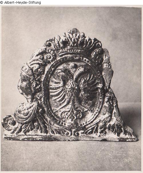 Top tile with double-headed eagle in crowned oval cartouche. On the left a turned away female half figure. A presumed counterpart on the right is lost.