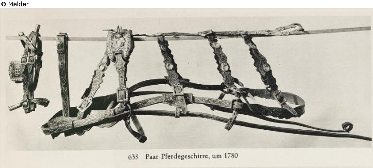 Louis XVI. Consisting of stirrup-harness, bridle, curb, drawbar, two-horsepost. Red leather quilted. Fittings and buckles in gold-plated bronze with leaf bars and belt loops.
