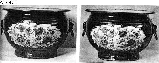 Mit Löwenmasken-Ringhenkeln. Famille rose-Dekor: Große blattförmige Reserven mit Blütenstauden und Vogel, auf pulverblauem Grund mit Goldmalerei von Prunusblüten und geborstenem Eis. Im Innern Fische und Krebse zwischen Wasserpflanzen. Geschnitzte, vergoldete Holzsockel der Louis-Philippe-Zeit. Höhe der Sockel 60 cm.