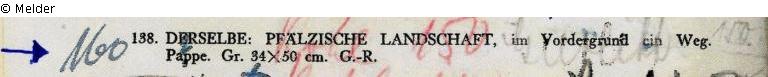 Collection Eduard Fuchs until 1933; 25.10.1933 confiscated by the Gestapo; auction house Rudolph Lepke Catalogue 2114, 16 and 17.06.1937, No. 138: "Pfälzische Landschaft, im Vordergrund ein Weg. Pappe. Gr[öße] 34 x 50cm, G.[old] – R.[ahmen]"; bought by Hildebrand Gurlitt for 160,- m (estimate: 150,- m); whereabouts unknown