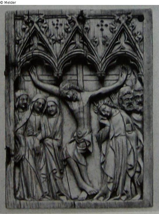 Search Request | Object report Panel of a diptych Lost Art-ID414765 Previous Next Artist / Creator Unknown (Französisch) TitlePanel of a diptych Dating1301/1400Object typeCrafts and other folk artsGroup of reported objectsCrafts and other folk artsMaterial / TechniqueIvory / carved Height 8.50 cm Width 6.00 cm Description under three Gothic arcade arches Christ on the cross, weeping women, John and two warriors Read more Read less Provenance Collection Max Silberberg, Breslau; 12.10.1935 auction Paul Graupe, Berlin, lot 229 (sold for 310 RM); whereabouts unknown Read more Read less Published since2010 Contact Dr. Monika TatzkowPositionWissenschaftlicher DokumentationsdienstPhone+49 (0) 30 64 128 13E-Mailtatzkow@t-online.de