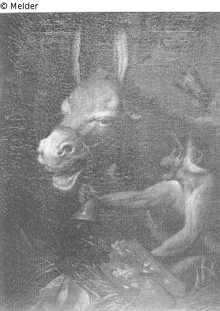 Im rechten Bildvordergrund sitzt ein Affe, der in der linken Pfote eine Palette und Pinsel hält, mit der rechten hält er eine Handglocke und den Zaum eins Esels; der hat das Maul zum Schrei geöffnet; im Vordergrund Stroh und ein aufgeschlagenes Buch (?); Signatur: K: DU Jardin 1677; Maße: 80,2 x 60 cm