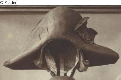 Braunes Haar auf Seidennetz mit hoher Bundfassung. Am Zopf Schleife mit Rosette in schwarzem Rips. Am Verschlussband besiegelt.