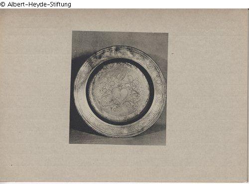 Pewter plate. On the lip alternating circles and acanthus vines in tremolier stitch. On top a cartouche with the inscription "B.H.N. / 1743". On the well acanthus tendrils around a heart, on top a soaring dove with a blossom branch in its beak.