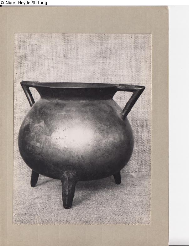Pipkin with a pressed, spherical body on three feet, funnel edge and acute-angled, marginal handles.
