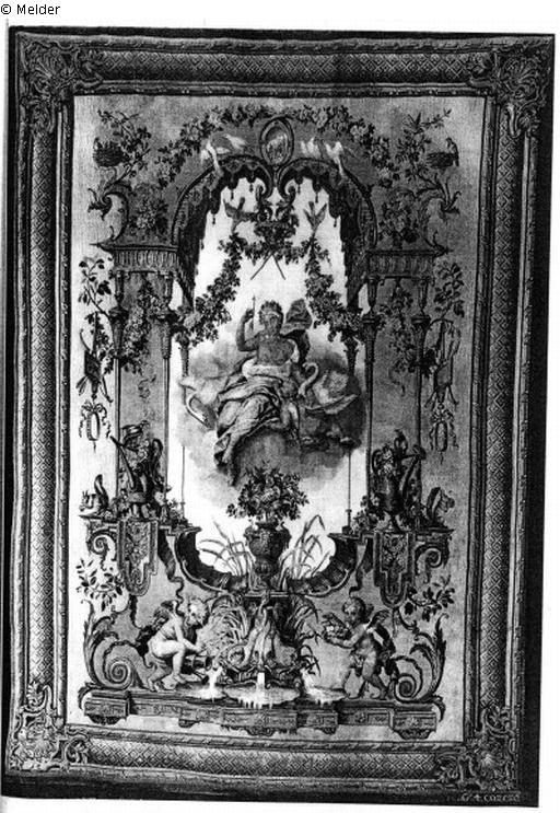 Von zwei Schwänen und Amor umgeben thront Venus, umrahmt von einer Groteskenarkade mit Blumenvasen, Blumengehänge, Vögeln und Eichhörnchen. Unten zwei Putten an einem Delphinbrunnen. Goldgelber und pfirsichfarbener Grund. Goldener Rahmen mit Rauten und Muschelecken. Bezeichnet: G. Cozette. Aus der Götterserie nach Audran. Vgl. aus einer gleichen Folge der Tapisserie im Quirinal Rom, Göbel, Wandteppiche in romanischen Ländern, Taf. 127. (Starke Ergänzungen.) Manufacture des Gobelins, Werkstatt Cozette