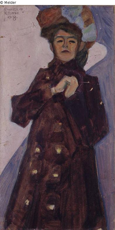 Sammlung Kamm: "Porträt der Schwester des Künstlers, Gerti, in schwarzem Mantel, 1908, Öl auf Karton, 30 x 15,5 cm. Signiert und datiert recto o. l. «Schiele Egon 08» Bezeichnet verso o. m. «Porträt Schwester Egon Schiele» Nachlassstempel verso o. m., Inv.-Nr. K.G 32."