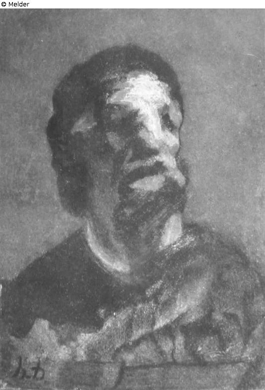 Portrait of a bareheaded man, en face, head with quarter turn to the right, in front of a brown-black background. Signed lower left