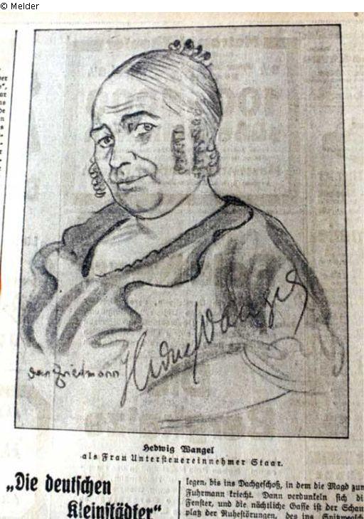 Theater actress of complex, grotesque and ugly parts, with Max Reinhardt's theaters and others in Berlin. Interruptions in her career because she was a philanthropist and founded a home for former female prisoners; Wangel in the role of "Frau Untersteuereinnehmer Staar" in the comedy "Die deutschen Kleinstädter" by August von Kotzebue (1761-1819) (Mrs. Assistant Tax Collector Staar); page 3; B.Z. am Mittag 178; July 2, 1925