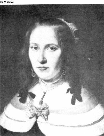 Portrait en face of a woman with long wavy hair clad in a dress with a large white collar trimmed with lace and with an expensive bow-shaped decoration on her breast. Bust length.