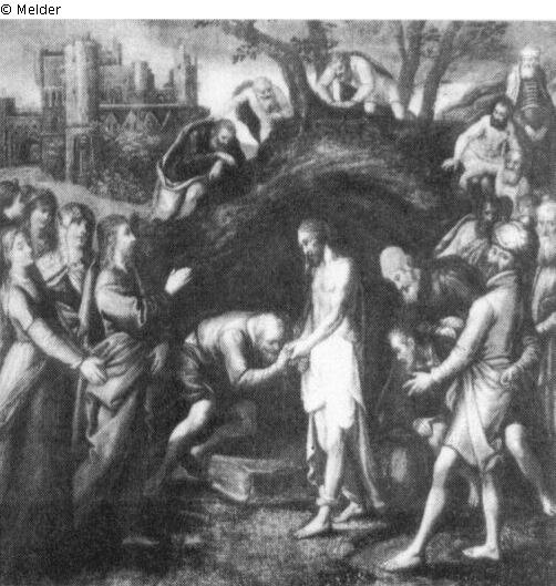 Lasarus standing in the center, near the entrance to a cave. Before him an old man on his knees, kissing Lasarus¿ hand. At the left is Christ, accompanied by woman. Above the cave are three figures of apostels. At the right is a group of men.