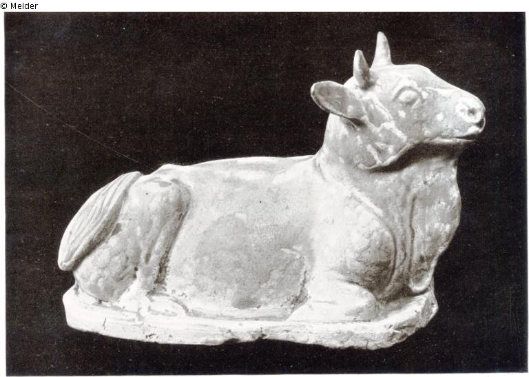 Collection Eduard Fuchs acquired between 1912-1922 and in his possession there until 1933; 25.10.1933 confiscation by the Gestapo; forced sale (payment of Reichsfluchtsteuer) by his daughter Gertraud Fuchs: Auction House Rudolph Lepke Berlin, Catalogue 2115, p. 8 - on 15.10 and 16.10.1937 this sculpture was auctioned under No. 54: "TONFIGUR: Liegender Stier; gelblichweiß glasiert. Höhe 9 cm. Leicht beschädigt“. According to the annotated Lepke catalog (Kunsthistorische Bibliothek, Den Haag) by the managing director Heinrich Peters (China-Bohlken, Potsdamer Straße 126, Berlin-Mitte) together with no. 53 auctioned for 38,- RM (no estimate). The transcript of the auction 2115 at the Reich Chamber of Fine Arts notes "Bohlken" in typescript and confirms the price of 38,- RM for both lots (Landesarchiv Berlin, A Rep. 243-04 Reich Chamber of Fine Arts - Landesleitung Berlin); whereabouts unknown