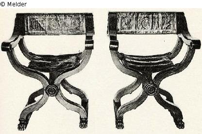 Nussholz (Savonarola-Form), geschweifte Lehnen mit Akanthusschnitzerei, Sitze und Lehnen mit goldgepresstem Leder bezogen.